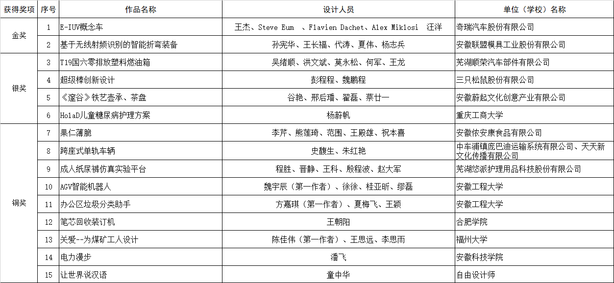 最終,來自奇瑞汽車的E-IUV概念車(概念設(shè)計(jì))與安徽聯(lián)盟模具工業(yè)有限公司的基于無線射頻識(shí)別的智能折彎裝備( 實(shí)物產(chǎn)品)榮獲本次大賽金獎(jiǎng),從設(shè)計(jì)理念、產(chǎn)品外形、先進(jìn)技術(shù)在產(chǎn)品中的應(yīng)用以及解決行業(yè)痛點(diǎn)等關(guān)鍵問題上,以上作品在行業(yè)中均處于領(lǐng)先水平。同時(shí),來自順榮股份、三只松鼠、美的冰箱、中車龐巴迪(蕪湖)、安徽工程大學(xué)、安徽工業(yè)大學(xué)等企業(yè)、高校投稿作品也在本次大賽中取得了優(yōu)異的成績。