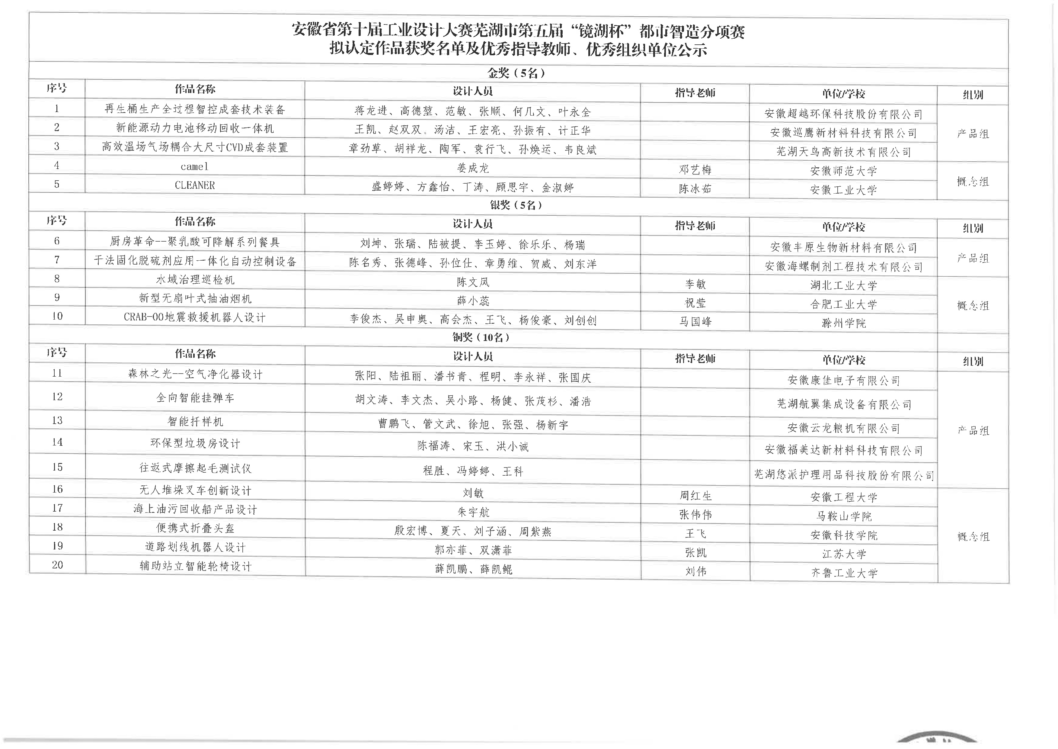 關(guān)于安徽省第十屆工業(yè)設(shè)計大賽蕪湖市第五屆“鏡湖杯”都市智造分項賽擬認(rèn)定作品獲獎名單及優(yōu)秀指導(dǎo)教師、優(yōu)秀組織單位的公示