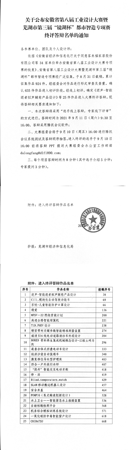 關(guān)于公布安徽省工業(yè)設(shè)計大賽“鏡湖杯”專項賽終評答辯名單的通知